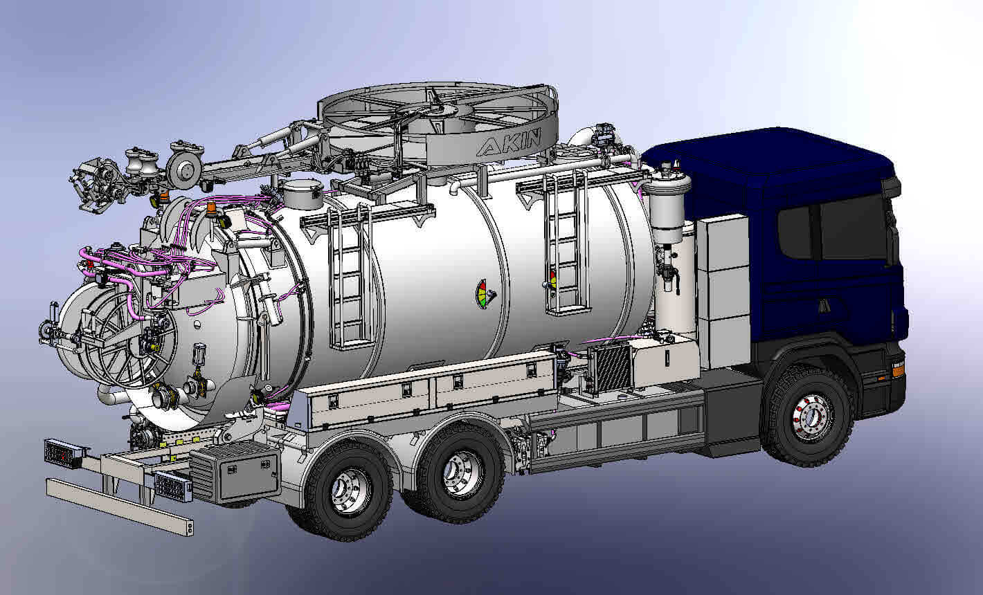Geri Dönüşüm Sistemi: Tank içerine çekilen atık su, belirli bir oranda filtre edilerek, santrifüj pompa sisteme gönderilir. Büyük partikülleri ayıran 1. filtre, suyu 2. siklon filtreye iletir. Filtrelenmiş su ve büyük parçacıklar, geri dönüş sistemiyle atık tarafına geri yönlendirilir. Ayrıca 2. siklon filtrede sabit basıncı ve debi miktarını koruyabilen sistem mevcuttur. Bu sayede, su pompasının ihtiyacı olan besleme devamlılığı sağlanmış olur. Sonunda, kanal açma pompasının ihtiyacı olan mikron temizliğinde su, temiz su haznesine taşınır. 1. Filtreleme, elek tamburunun döndürülmesiyle gerçekleştirilir. Sıyırıcı sistemi, tamburu tıkanmalardan korur.